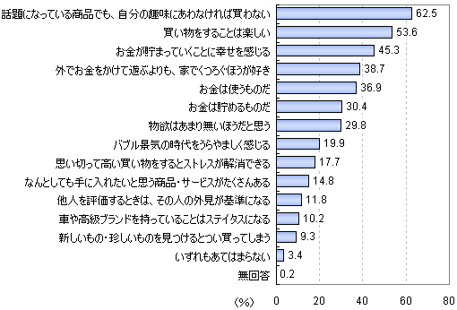 「話題になっている商品でも、自分の趣味にあわなければ買わない」(62.5%)、「買い物をすることは楽しい」(53.6%)が5割を超えています。