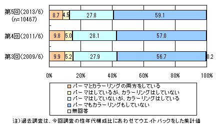 「パーマはしていないが、カラーリングはしている」が28.7%、「パーマもカラーリングもしていない」が59.1%です。