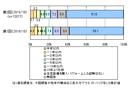 〔あなたは、住宅設備を購入・リフォームした経験がありますか。直近で実施した時期についてお聞かせください。※住宅設備とは、浴室、トイレ、キッチン(システムキッチン、コンロなど)、洗面所、床・壁、窓・サッシ、車庫など〕