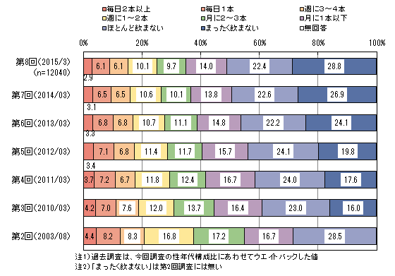 缶コーヒーを飲む人は7割強で、過去調査と比べて減少傾向です。週1本以上飲む人は全体の3割弱、男性30・40代では各半数弱を占めます。FIRE主飲用者、WONDA主飲用者では週1本以上飲用者が半数弱と、他の層より飲用頻度が高くなっています。