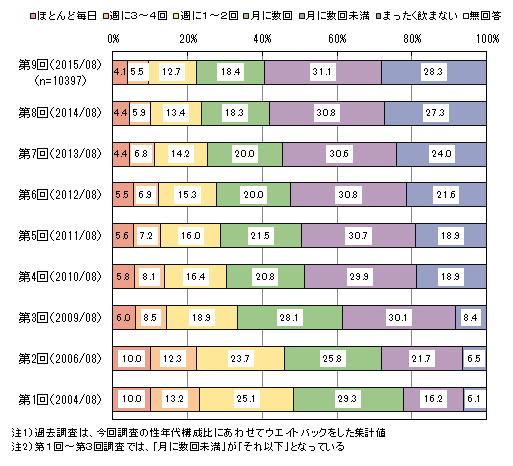 〔(全員)あなたは、市販の果汁入り飲料をどのくらいの頻度で飲んでいますか。※野菜汁入り飲料は含みません。また炭酸飲料やゼリー状の飲料も含みません。〕