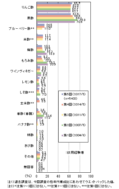 飲用経験者が飲んだことがあるのは、「りんご酢」「黒酢」が各60%台で、上位2位です。