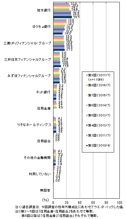 メインバンクは、全体では「地方銀行」が25.6%、「ゆうちょ銀行」「三菱UFJフィナンシャルグループ」が各2割弱です。