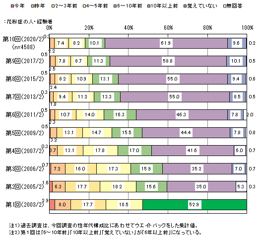 〔(花粉症の方)あなたが花粉症であることを最初に自覚したのはいつ頃ですか。〕
