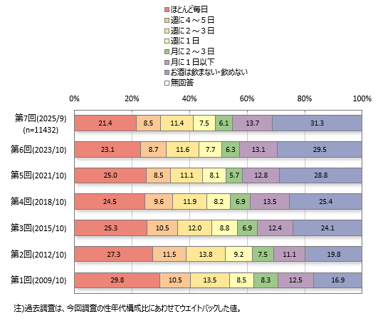 「ほとんど毎日」は21.4%、週1日以上飲用者は全体の5割弱です。