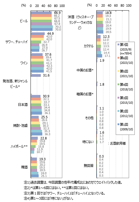 酒類飲用者が好きなお酒は「ビール」が66.9%、「サワー、チューハイ」が44.9%、「ワイン」が37.6%、「発泡酒、新ジャンルビール」「日本酒」が各3割強です。過去調査と比べると、「ハイボール」が増加傾向、「サワー、チューハイ」は2018年以降増加傾向です。「焼酎・泡盛」は減少傾向です。