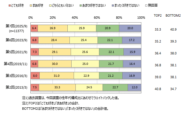 料理が好きな人(「とても好き」「まあ好き」の合計)は全体の3割強で、過去調査と比べて減少傾向です。
