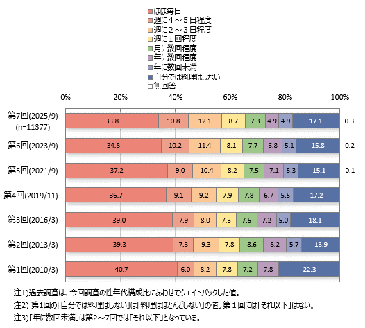料理を「ほぼ毎日」する人の比率は全体の33.8%で、過去調査と比べて減少傾向となっています。男性1割強、女性6割強で、女性は高年代層ほど比率が高くなっています。