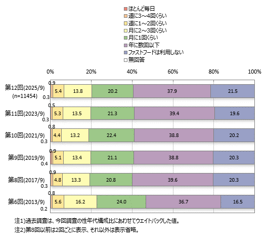 【Q1.(全員)あなたは、普段、ハンバーガー、ドーナツなどのファストフード店をどれくらいの頻度で利用していますか。テイクアウト・デリバリーの利用も含みます。※ここではハンバーガー、ドーナツなどの洋風ファストフードについてお聞きします。(牛丼やうどんなどの和風ファストフード店は除く。Q2以降も同様)】