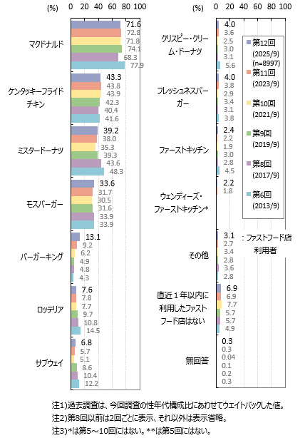 ファストフード利用者が、直近1年以内に利用したことがあるファストフード店は「マクドナルド」が71.6%、「ケンタッキーフライドチキン」が43.3%、「ミスタードーナツ」「モスバーガー」が各30%台です。