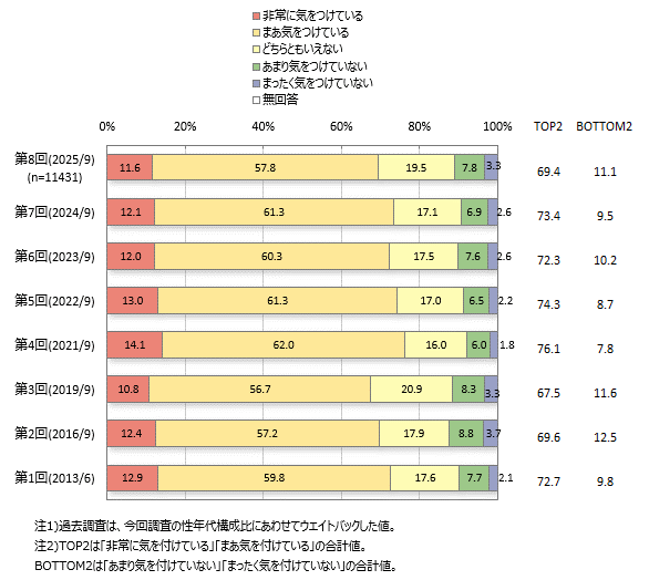 健康に気をつけている人(「非常に気をつけている」「まあ気をつけている」の合計)は7割弱、健康に気をつけていない人(「あまり気をつけていない」「まったく気をつけていない」の合計)は1割強です。