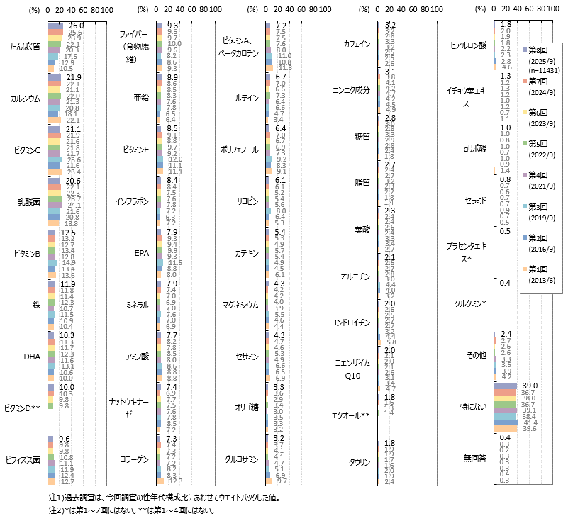 摂取成分は「たんぱく質」が26.0%、「カルシウム」「ビタミンC」「乳酸菌」が各2割強、「ビタミンB」「鉄」「DHA」「ビタミンD」が各1割強です。「たんぱく質」は過去調査と比べ微増傾向です。