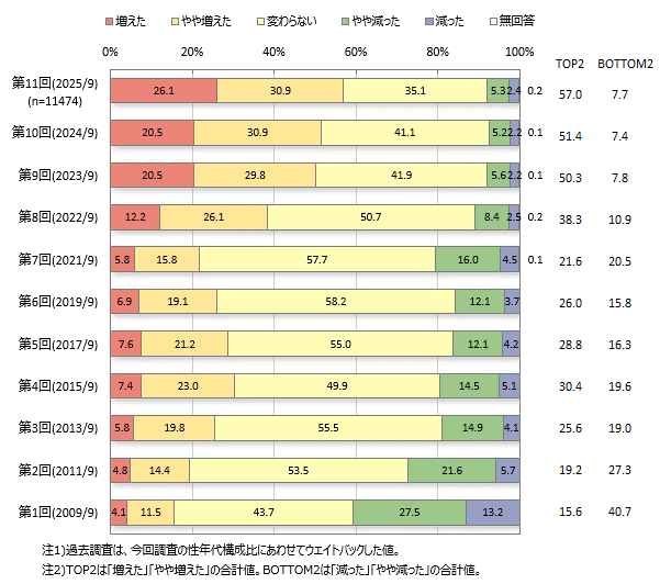 1年前と比べ生活全体の支出額は増えた人(「増えた」「やや増えた」の合計)が6割弱、減った人(「減った」「やや減った」の合計)が約8%、「変わらない」が35.1%です。2024年調査と比べ、増えた人の比率が増加しています。