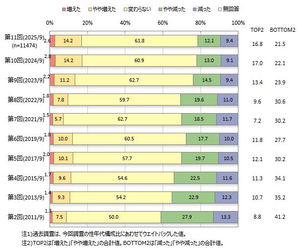 1年前と比べた、生活全体の収入額が増えた人(「増えた」やや増えた」の合計)は2割弱、減った人(「減った」「やや減った」の合計)は2割強、「変わらない」が6割強です。2024年調査とほぼ同程度となっています。