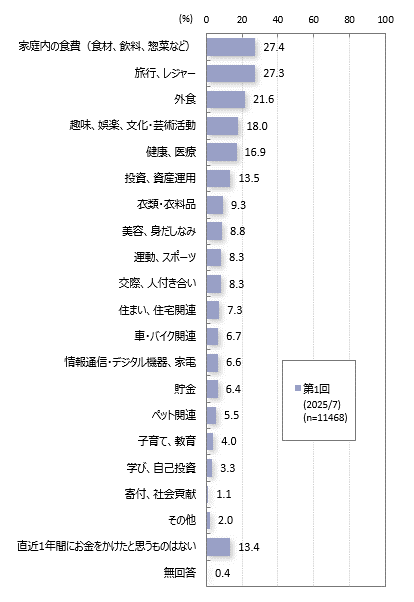 直近1年間に比較的お金をかけた分野は「家庭内の食費(食材、飲料、惣菜など)」「旅行、レジャー」がそれぞれ約27%、「外食」が21.6%、「趣味、娯楽、文化・芸術活動」「健康、医療」が各2割弱です。