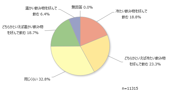 冷たい飲み物派(「冷たい飲み物を好んで飲む」「どちらかといえば冷たい飲み物を好んで飲む」の合計)は約42%、温かい飲み物派(「温かい飲み物を好んで飲む」「どちらかといえば温かい飲み物を好んで飲む」の合計)は約25%で、冷たい飲み物派の方が多くなっています。「同じくらい」は32.8%です。