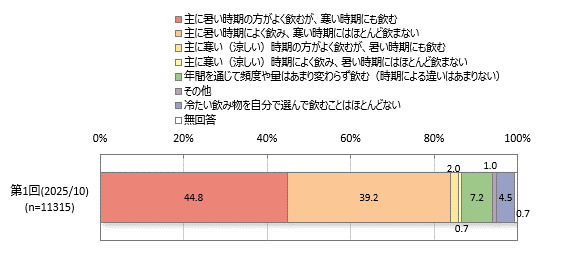冷たい飲み物を飲む時期については「主に暑い時期の方がよく飲むが、寒い時期にも飲む」(44.8%)と「主に暑い時期によく飲み、寒い時期にはほとんど飲まない」(39.2%)をあわせ、暑い時期に飲む人は8割強です。