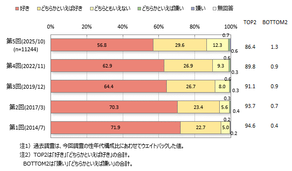 和食が好きな人(「好き」「どちらかといえば好き」の合計)は86.4%です。「好き」(56.8%)の比率は過去調査と比べ減少傾向です。