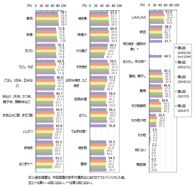 和食を食べる頻度が1日2回以上と高い層では、「寿司」「刺身」に続いて「ごはん(白米、玄米など)」「うどん、そば」「味噌汁」「焼き魚」などが上位にあがっており、普段の食事で食べるメニューが、他の層より上位にあがっています。