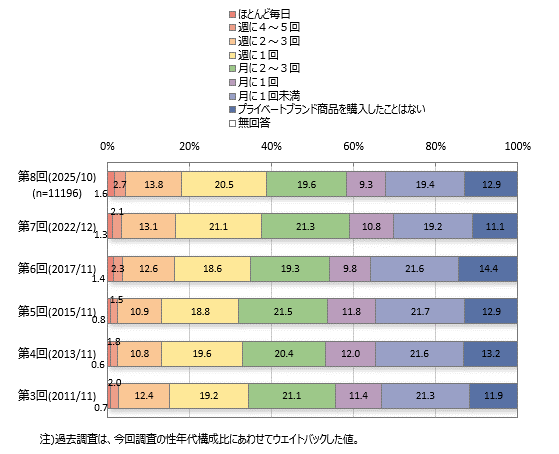 【Q1.(全員)あなたは、どれくらいの頻度でプライベートブランド商品(PB商品)を購入しますか。※プライベートブランド商品(PB商品):スーパーやコンビニ、ドラッグストアなどが独自のブランドで企画・販売している商品。無印良品やニトリなどの専門店ブランドやメーカー直営ブランドは除く。】