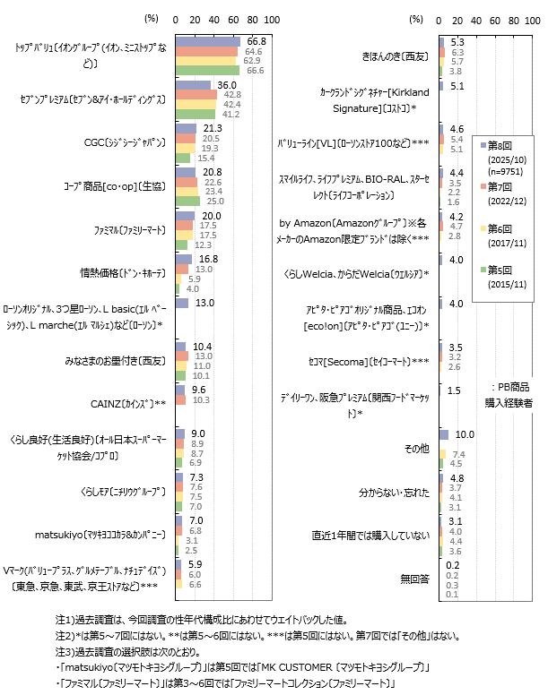 プライベートブランド購入経験者が、直近1年間に購入した商品は、「トップバリュ」が66.8%、「セブンプレミアム」が36.0%、「CGC」「コープ商品」「ファミマル」が各2割強です。
