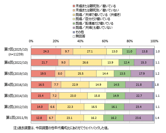 「既婚/夫婦で働いている(共働き)」が27.1%、「未婚または離死別/働いている」が24.3%です。