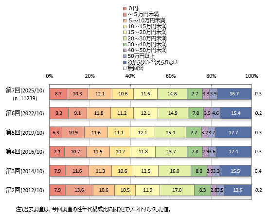 女性60~70代では「5~10万円未満」がボリュームゾーンとなっています。また、女性50~60代では「0円」が他の層よりやや高くなっています。