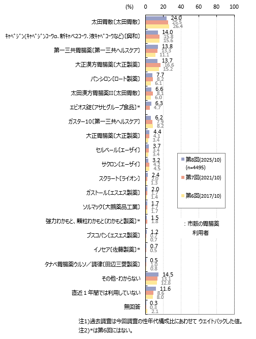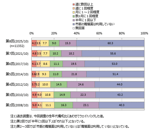 胃腸薬利用者は全体の4割弱で、過去調査と比べ減少傾向です。
