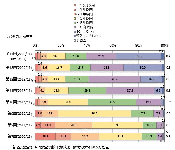 薄型テレビ所有者の購入時期は、「10年よりも前」が35.0%、「~10年以内」が22.9%です。