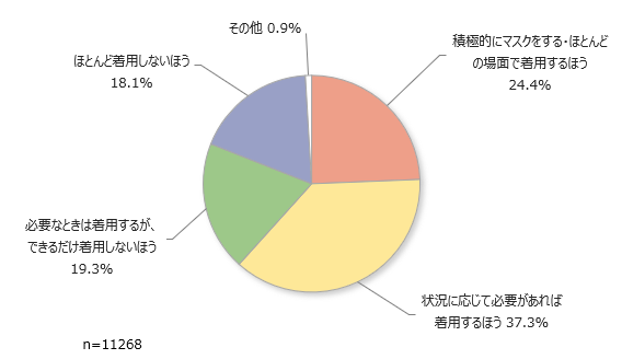 マスク着用に関する意識について、「積極的にマスクをする・ほとんどの場面で着用するほう」(24.4%)と「状況に応じて必要があれば着用するほう」(37.3%)をあわせた、マスク着用意向者の比率は6割強です。マスク非着用意向者は、「必要なときは着用するが、できるだけ着用しないほう」「ほとんど着用しないほう」を合わせて4割弱となっています。
