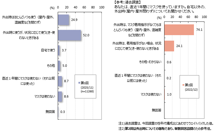 2022年12月 ■直近1年間の外出時「マスク着用指示がなくてもほとんどいつも使う」は全体の約74%、「状況に応じて使う・使わないときがある」は2割強。外出時常時マスク使用理由は「新型コロナウイルスの感染予防・周囲への拡大予防」が9割強、「(コロナ以外の)感染症の予防」が5割強。「習慣になっている」「風邪の予防」が各30%台、「マナーだと思う」が3割弱。 ■直近1年間の外出時マスク使用者の使用場面は「人が密集する場所、大勢で集まる」「感染症が流行している時期」が各6割前後、「人と会話をする」「自分が風邪など人に感染する症状や病気」「周囲に風邪など人に感染する症状や病気の人がいる」が各40%台、「周りの人がマスクをしている」が3割強。 ■直近1年間外出時マスク使用者のうち「使い捨てタイプを1枚使う」が9割弱、「市販の、洗って繰り返し使えるタイプ」が16%、「手作りのマスク(市販品以外)」が約4%。「大容量」購入者が5割強。 ■直近1年間外出時マスク使用者の重視点は「使い捨てタイプ」が8割弱、「価格」「大きさ」が各30%台、「フィット感」「素材」が各3割弱、「立体構造、プリーツ型などの形状」が2割強。期待する効能・効果は「細菌やウイルス、花粉、ハウスダストなどのカット率が高い」が7割弱、「息苦しくない」が4割強、「耳が痛くならない」「フィットする」が各30%台。