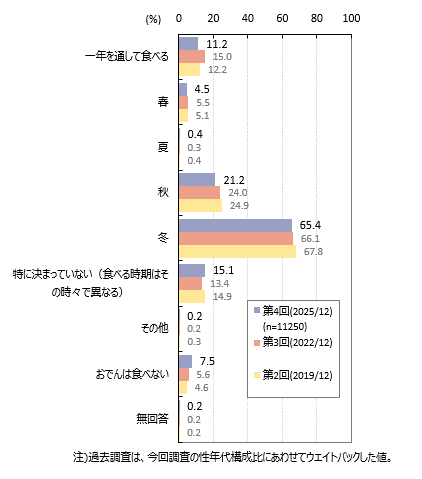 「一年を通して食べる」は11.2%です。「特に決まっていない(食べる時期はその時々で異なる)」は15.1%となっています。