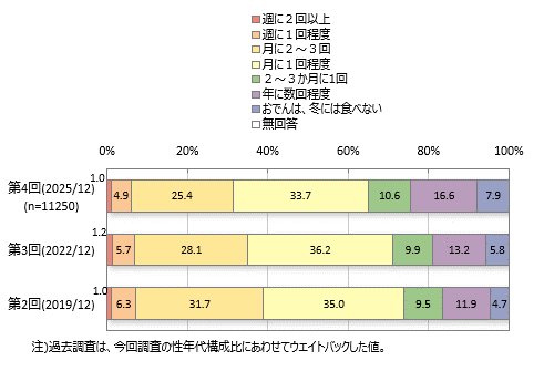 冬におでんを食べる頻度は、「月に1回程度」「月に2~3回」がボリュームゾーンです。