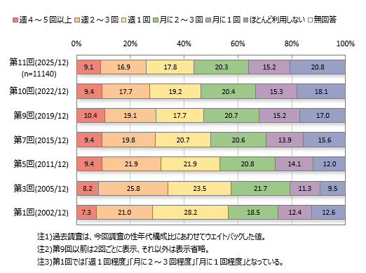 コンビニエンスストア利用者に占める比率をみると、週1回以上利用者は約55%、週4~5回以上は1割強です。男性40~50代では週1回以上が各7割弱、週4~5回以上は各2割強で他の層より高く、利用頻度が高いことがうかがえます。