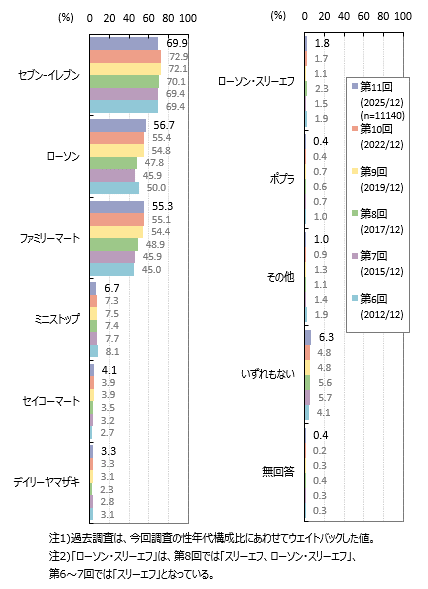 商品・サービスをよく利用するコンビニエンスストアは、全体では「セブン‐イレブン」が69.9%、「ローソン」56.7%、「ファミリーマート」55.3%です。