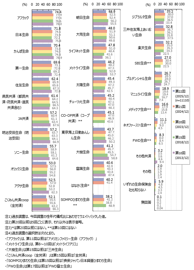 知っている生命保険会社の上位3社は「アフラック」「日本生命」「かんぽ生命」で各7割強の認知率です。続く「第一生命」は7割弱となっています。