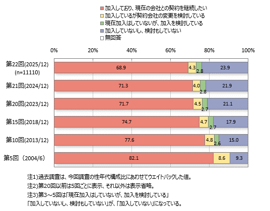 「加入しており、現在の会社との契約を継続したい」は全体の68.9%です。60~70代で約75~76%と高いのですが10・20代で3割強、30代で5割弱と低く、年代差がみられます。