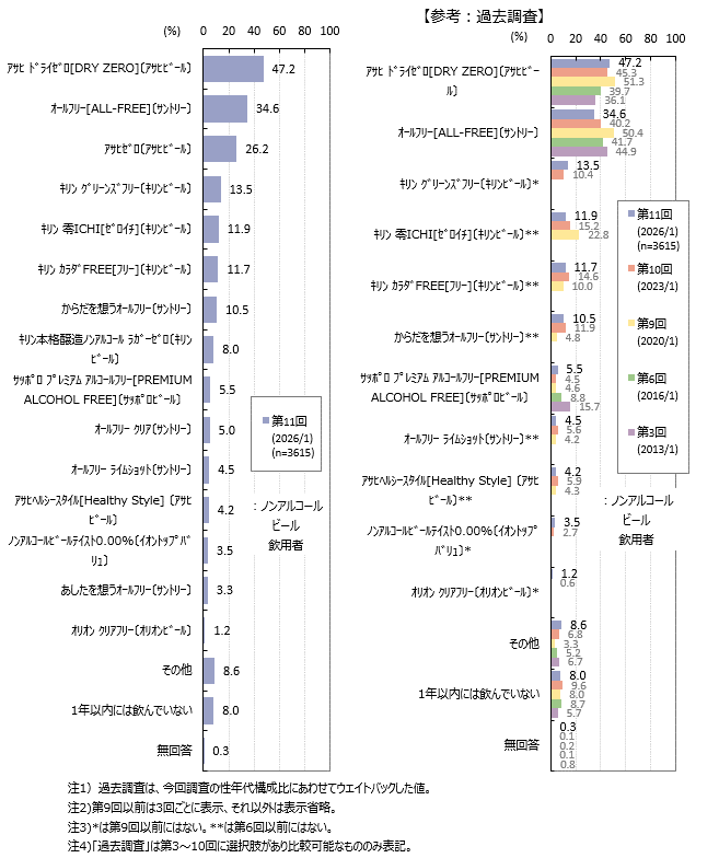 ノンアルコールビール飲用者が直近1年間に飲んだノンアルコールビールは「アサヒ ドライゼロ」が47.2%、「オールフリー」が34.6%、「アサヒゼロ」が26.2%です。