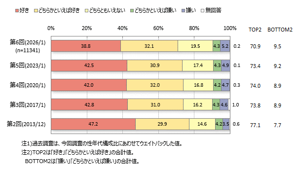 男性10~40代では「好き」の比率が低く、「どちらともいえない」の比率が高くなっています。