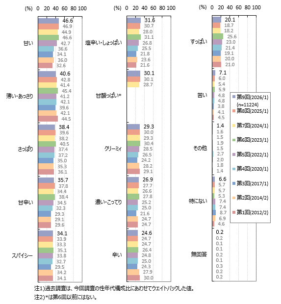 2025年01月 ■好きな味は「甘い」「薄い・あっさり」が各40%台、「さっぱり」「甘辛い」がそれぞれ約38~39%、「スパイシー」「塩辛い・しょっぱい」「クリーミィ」が各3割強。つい選んでしまう最も好きな味は「甘い」が約15%、「甘辛い」「スパイシー」「薄い・あっさり」「塩辛い・しょっぱい」が各1割前後。 ■ここ2~3年で食べるようになった味がある人は全体の3割弱。上位項目は「薄い・あっさり」「スパイシー」「さっぱり」など。食べなくなった味がある人は4割弱で、「濃い・こってり」「塩辛い・しょっぱい」「辛い」などが上位。 ■好きな味のベースは「しょうゆ」「かつおだし」が各40%台、「昆布だし」「塩こしょう」「みそ」が各30%台、「カレー」「塩」「チーズ」が3割弱。「チーズ」「ミルク・クリーム系」「ぽん酢」「甘酢」などは女性の方が比率が高い。 ■お菓子類の好きな味・フレーバーは「チョコレート」が5割弱、「バニラ」が41.3%、「コーヒー」「ナッツ系」「抹茶」が各30%台、「はちみつ、メープルシロップ」「キャラメル」「いちご、ストロベリー」「ミルク」などが各3割弱。
