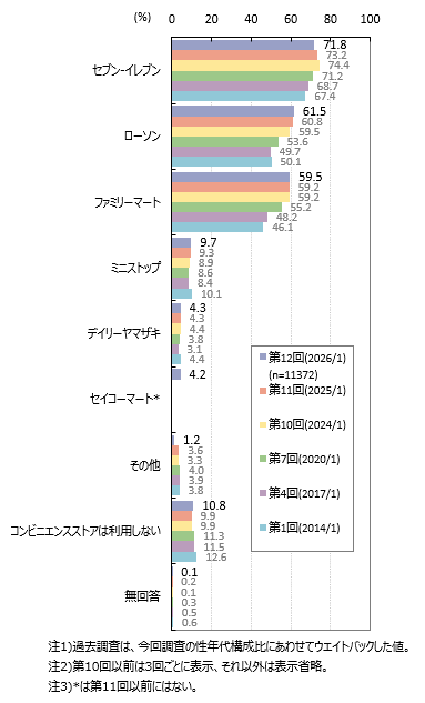 普段利用するコンビニエンスストアは、全体では「セブン‐イレブン」が71.8%、「ローソン」が61.5%、「ファミリーマート」が59.5%です。
