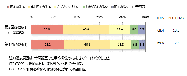 腸の健康の関心層(「関心がある」「まあ関心がある」の合計)は7割弱、非関心層(「関心がない」「あまり関心がない」の合計)は1割強です。