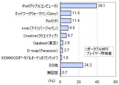 利用しているブランドのトップは「iPod(アップルコンピュータ)」(39.1%)で、次位の「ネットワークウォークマン(Sony)」を大きく引き離しています。