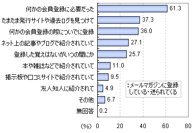 「何かの会員登録に必要だった」(61.3%)がもっとも多く、「たまたま発行サイトや過去ログを見つけて」(37.3%)、「何かの会員登録の際についでに登録」(36.0%)が続きます。