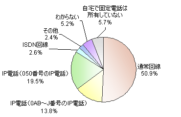 「IP電話(050番号のIP電話)」が19.5%、「IP電話(0AB~J番号のIP電話)」が13.8%で、『IP電話利用者』は33.3%となりました。「通常回線」が半数を超えもっとも多くなっています。