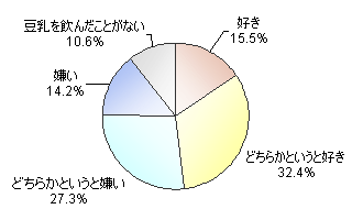 豆乳が好きな人(「好き」+「どちらかというと好き」)は47.9%で、全体の約半分となっており、豆乳が嫌いな人(「どちらかというと嫌い」+「嫌い」)の41.5%を若干上回りました。