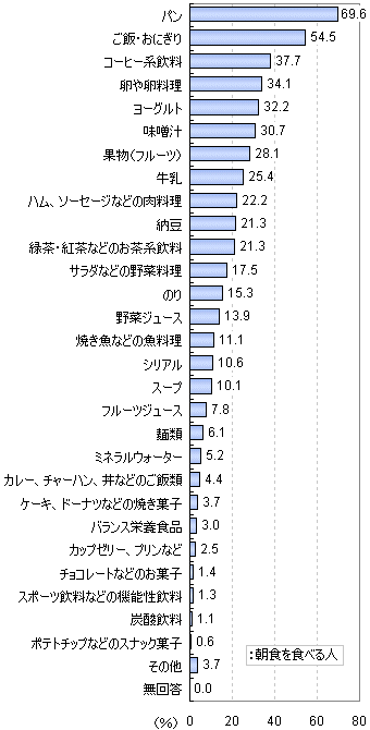 普段の朝食の内容は「パン」が69.6%、「ご飯・おにぎり」が54.5%で、パン派の方が多くなっています。