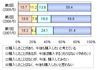 「購入したことがあり、今後も購入したいと考えている」は15.7%と、前回調査より3ポイント低下しています。「購入したことはないが、今後、購入してみたい」も13.6%と前回調査より5ポイント以上下がっており、購入意向は合わせて10ポイント近く低下しています。