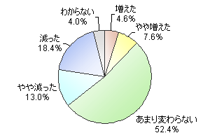 「あまり変わらない」が半数を占めますが、『増加』(「増えた」+「やや増えた」)12.2%に対し、『減少』(「やや減った」+「減った」)が31.4%と、減少した人の方が多くなっています。