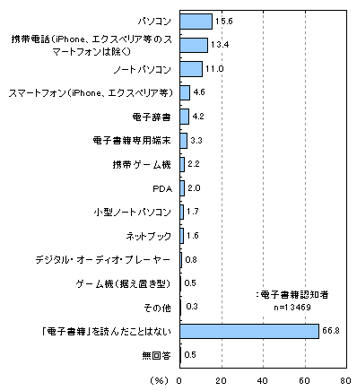 電子書籍を読んだことがある人は、電子書籍認知者の32.7%です。利用端末は「パソコン」(15.6%)、「携帯電話(iPhone、エクスペリア等のスマートフォンは除く)」(13.4%)、「ノートパソコン」(11.0%)などが多くなっています。